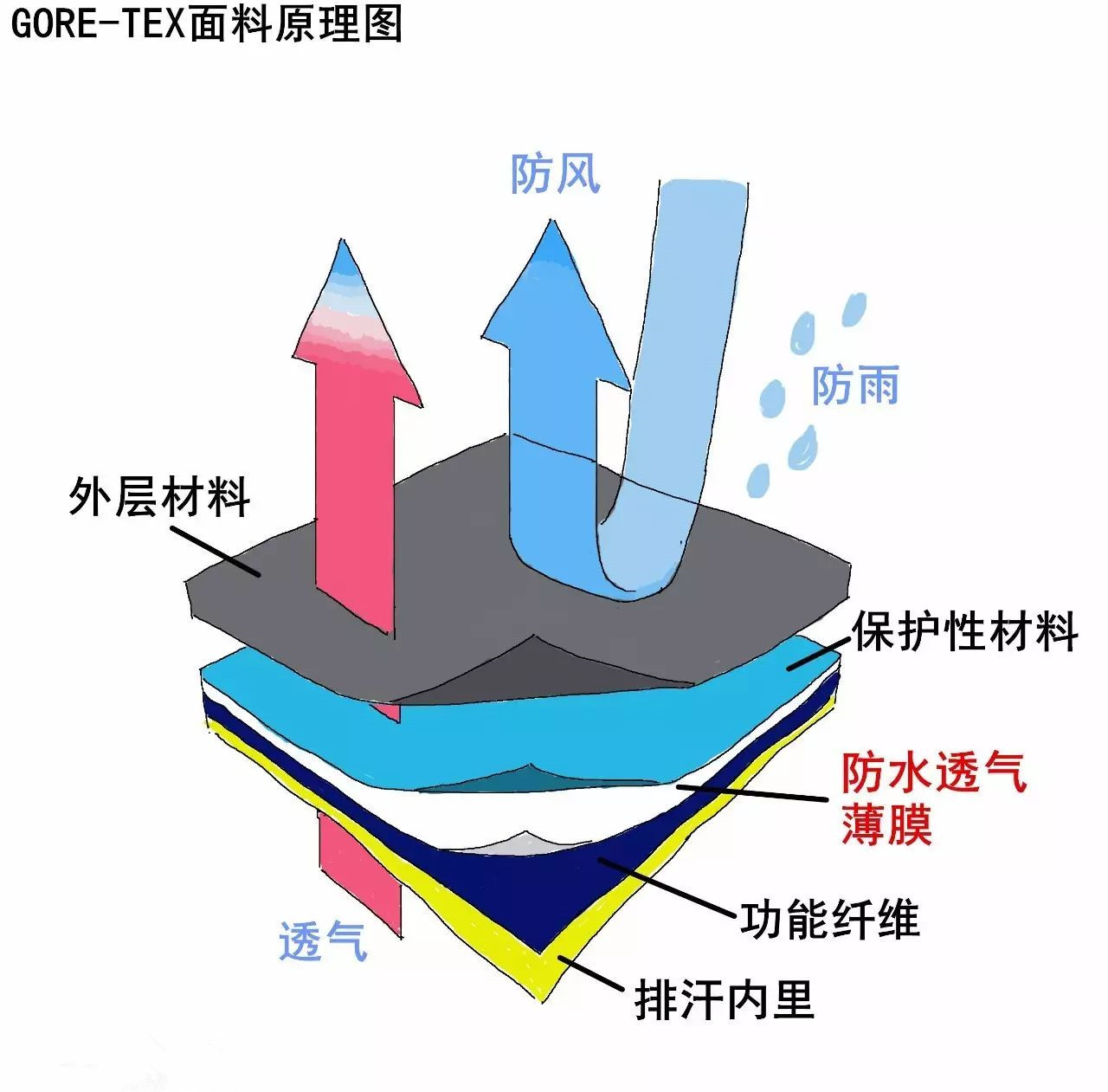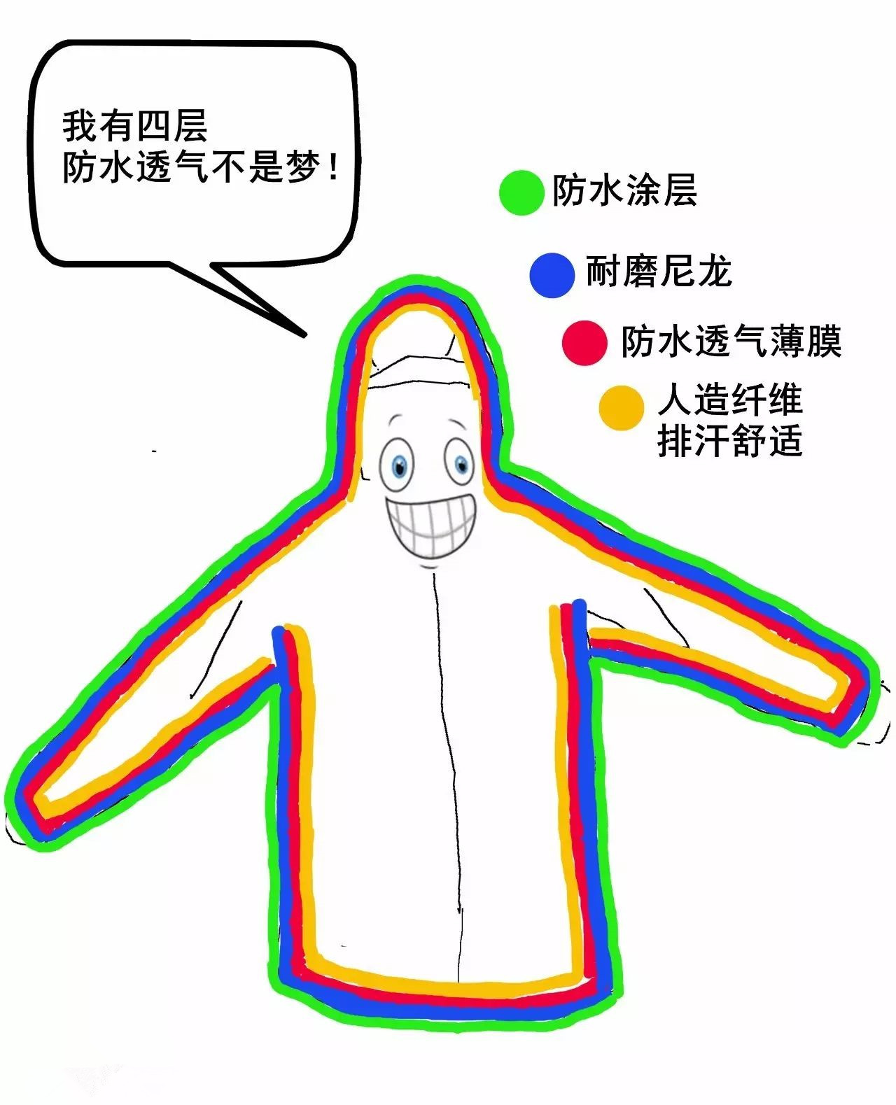基于以上原理,現(xiàn)代沖鋒衣都是采用多層結構,涂層,尼龍,薄膜,人造纖維共同作用實現(xiàn)持續(xù)的防水透氣效果。
