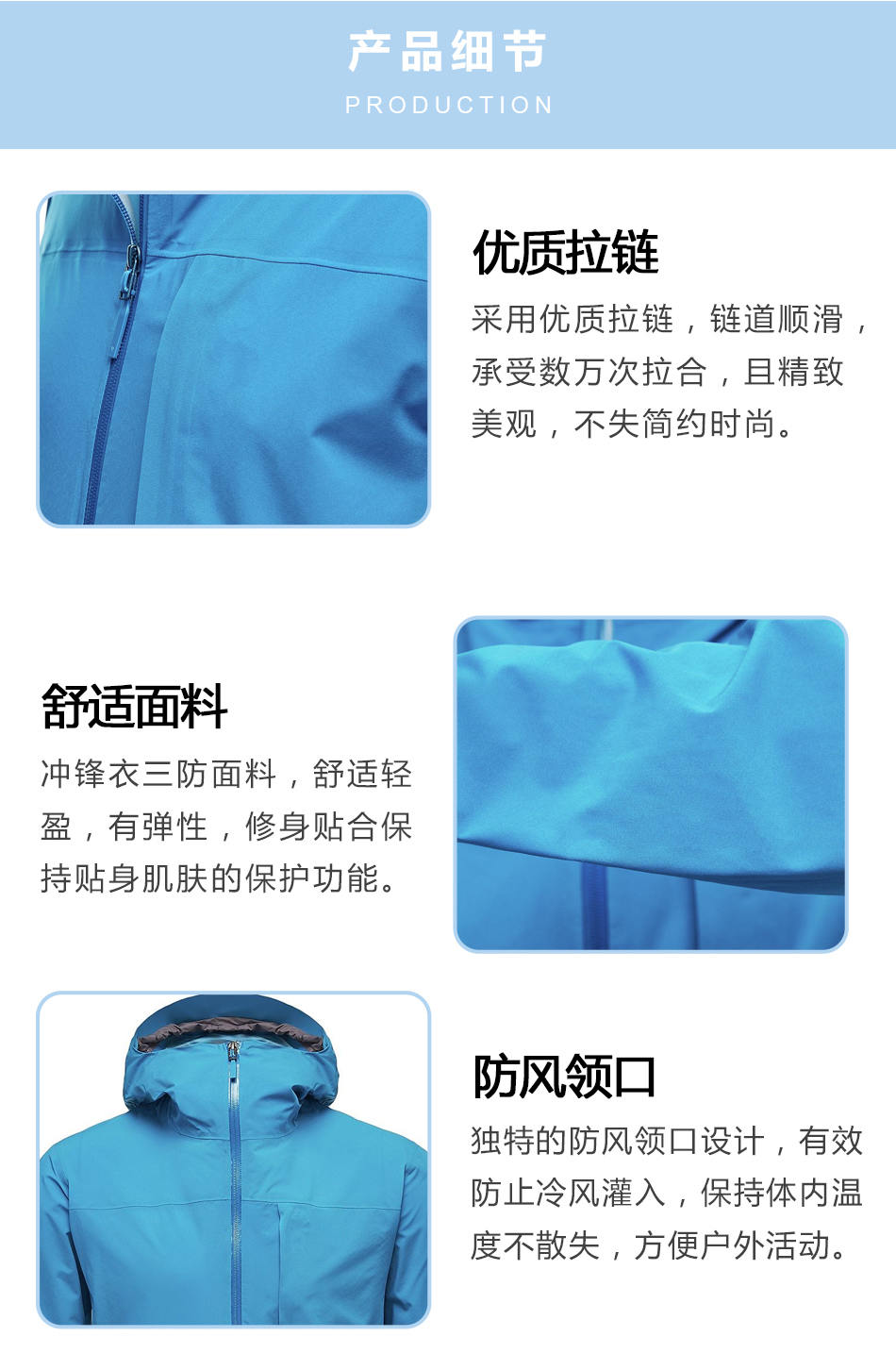 舒適面料沖鋒衣加工使用三防面料,舒適輕盈,有彈性,修身貼合保持貼身肌膚的保護功能。