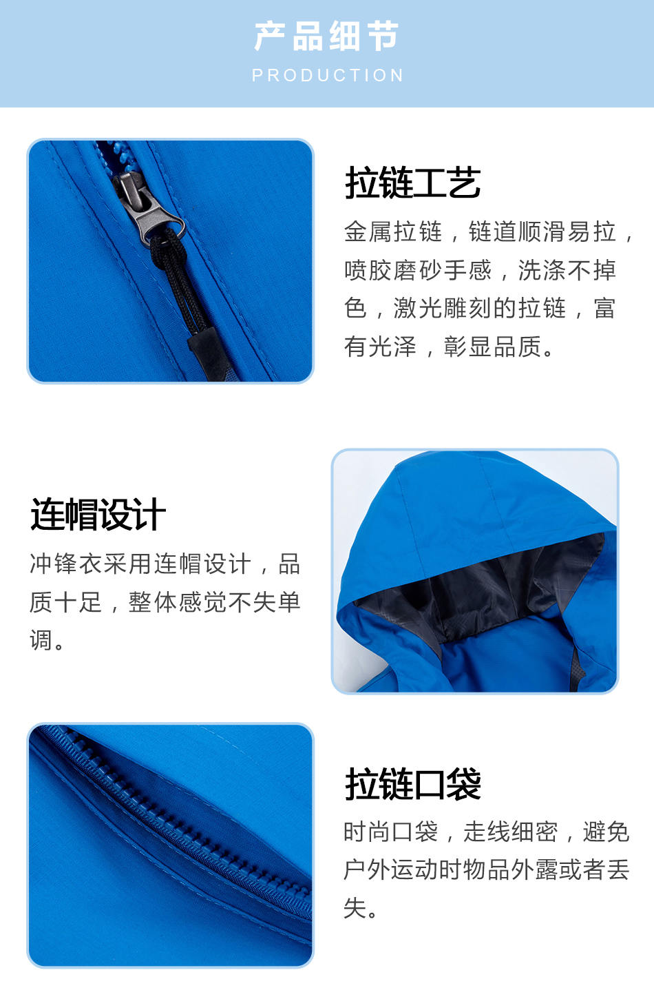 • 連帽設計運動服沖鋒衣定制采用連帽設計,品質十足,整體感覺不失單調。