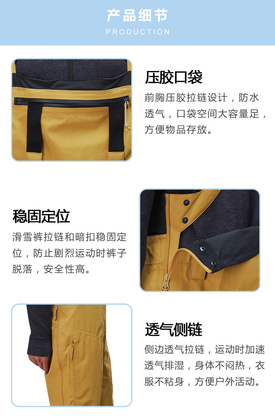 • 穩固定位滑雪褲加工的拉鏈和暗扣穩固定位,防止劇烈運動時褲子脫落,安全性高。